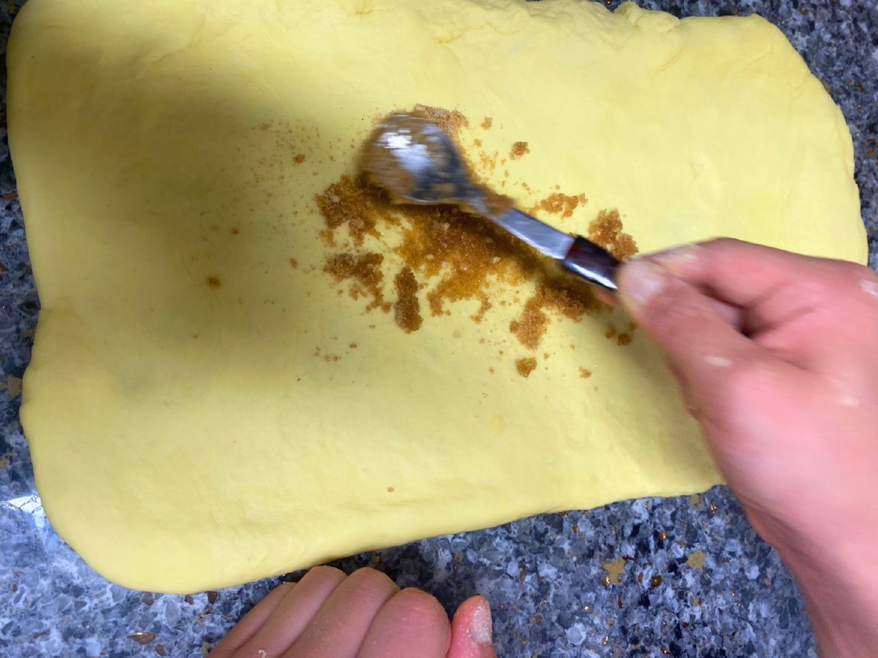 2. 호떡믹스의 설탕가루에 시나몬가루 약간, 오일 2스푼과 녹인 버터 1스푼을 넣어 섞은 다음에, 1번의 반죽에 넓게 묻혀줍니다.