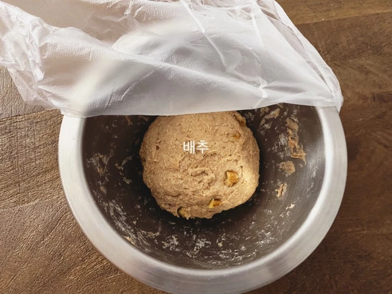 2. 1번 반죽에 호두를 넣어서 동글게 만들어서 랩을 씌워서 냉장고에 넣어두고 주무세요.