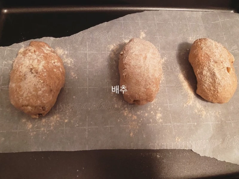3. 다음 날 일어나자마자 냉장고에 둔 반죽을 5회 정도 주물러준 다음에, 성형해서 40분 상온발효시켜 보아요.