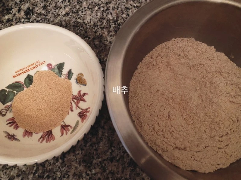 1. 통밀과 소금을 잘 섞어주고, 거기에 이스트를 풀어준 미지근한 물을 넣어서 조물조물해 줍니다.