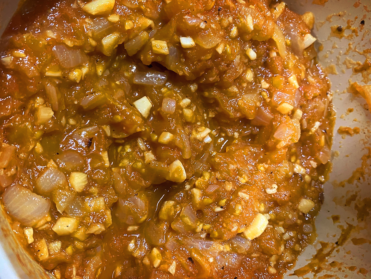 3. 토마토에서 물이 나오기 시작하면 뭉개주면서 액체화시킵니다. 이때 고추장 1/2스푼을 넣어주면 감칠맛도 돌고 약간 매콤해져요.