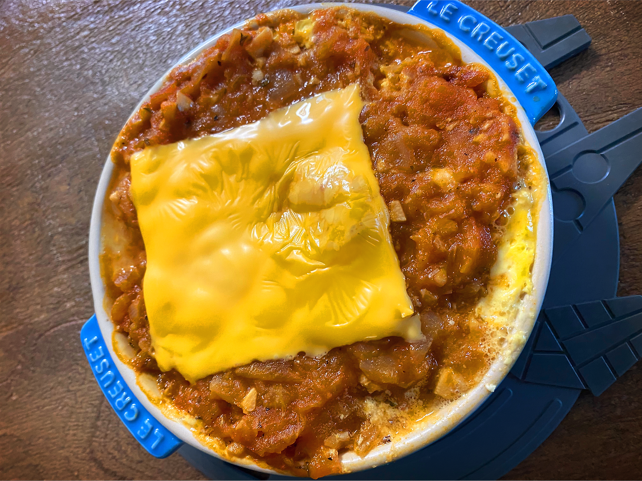 두부 반모에 계란 하나를 풀어서 수제 토마토소스를 얹고 체다치즈 한 장 올립니다. 3분 정도 전자레인지에