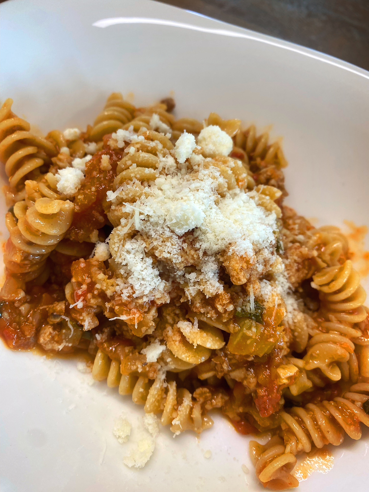 파스타를 끓여서 라구소스를 붓고 치즈가루를 뿌리니 먹음직스럽네요! 회사에 가져가서 먹어도 맛있더라고요!