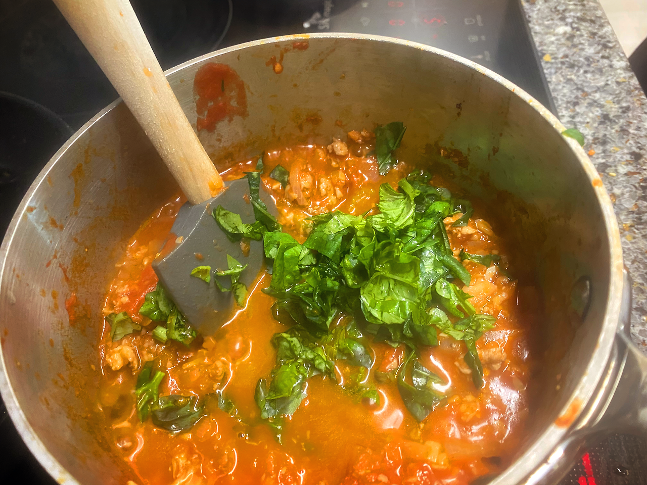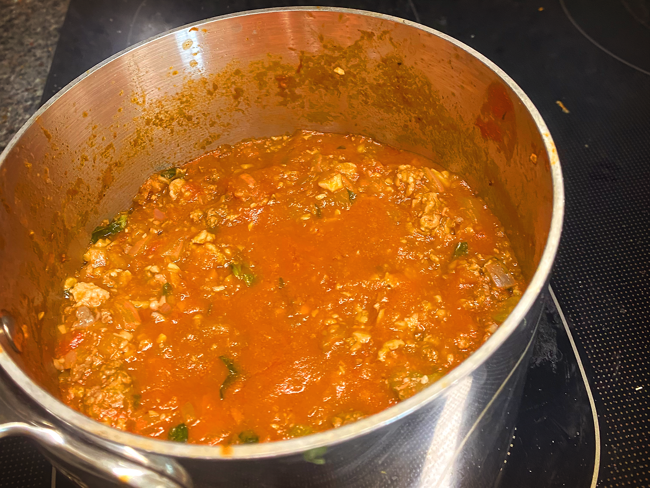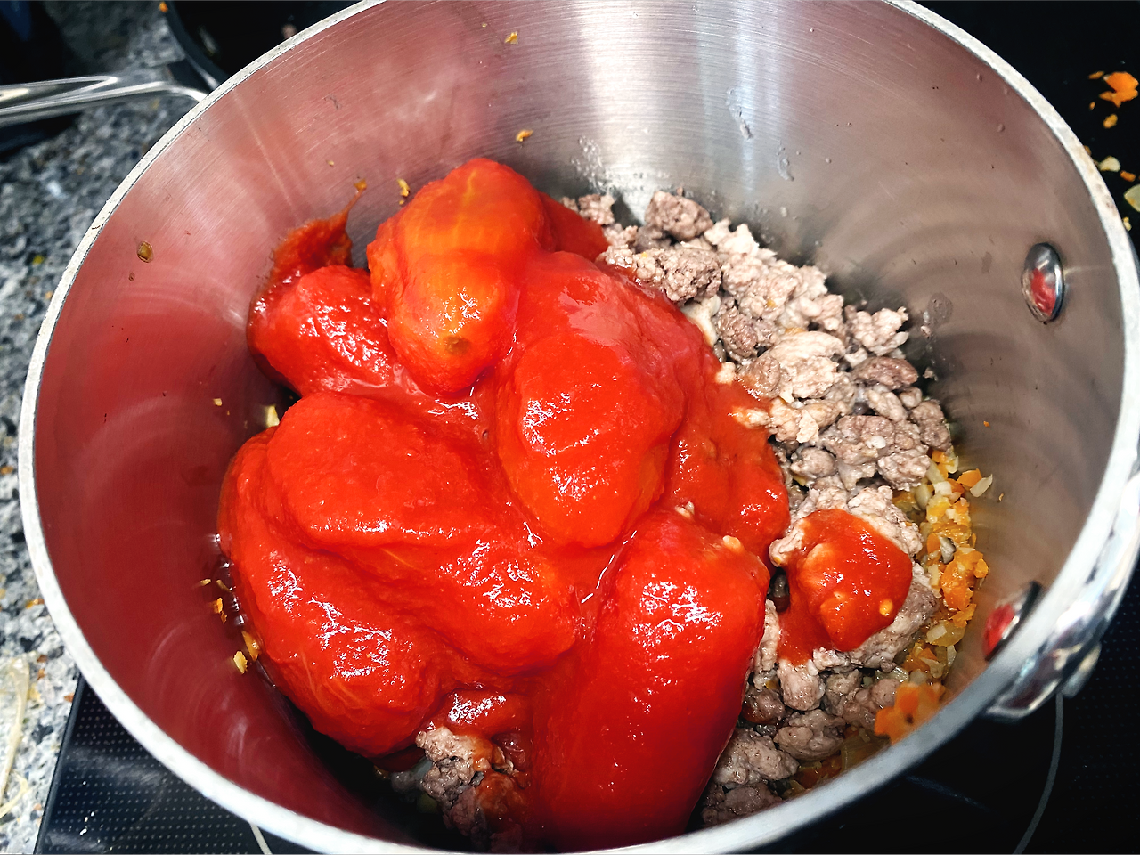 3. 1과 2의 재료를 몽땅 넣고 재료 3도 전부 넣어서 끓여줍니다. 특히 홀토마토 캔은 한통 다 넣으시고, 국물이 모자란 듯싶으시면, 물을 가감해 주세요. 국물을 졸일꺼라서 전 부족한 듯 보여도 안넣었어요.