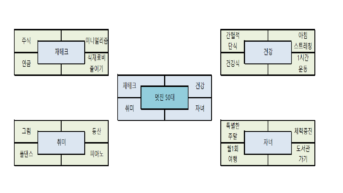그래서 저도 만다라트를 만들어 보았습니다. 너무 먼 미래까지는 생각하기 어려웠고, ’ 멋진 50대‘가 되는 걸 목표로 잡아보았지요. 9가지 덕목을 생각하기에는 너무 지치고 게을렀기 때문에 4가지로 압축해 보았더니 이런 표가 나오더군요.