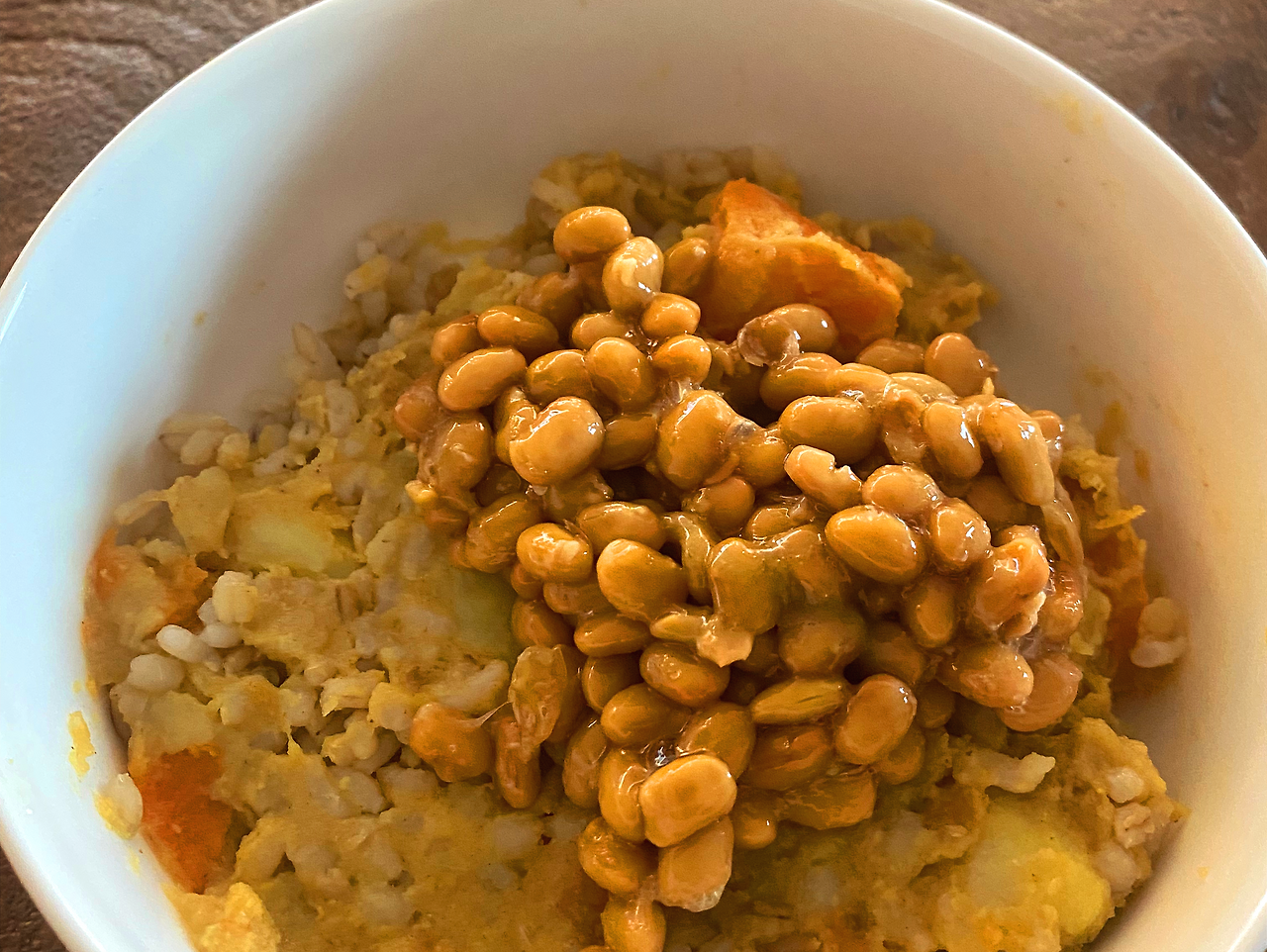 1. 밥에 카레를 비빈 후, 낫또를 얹습니다. 낫또도 비벼주세요.