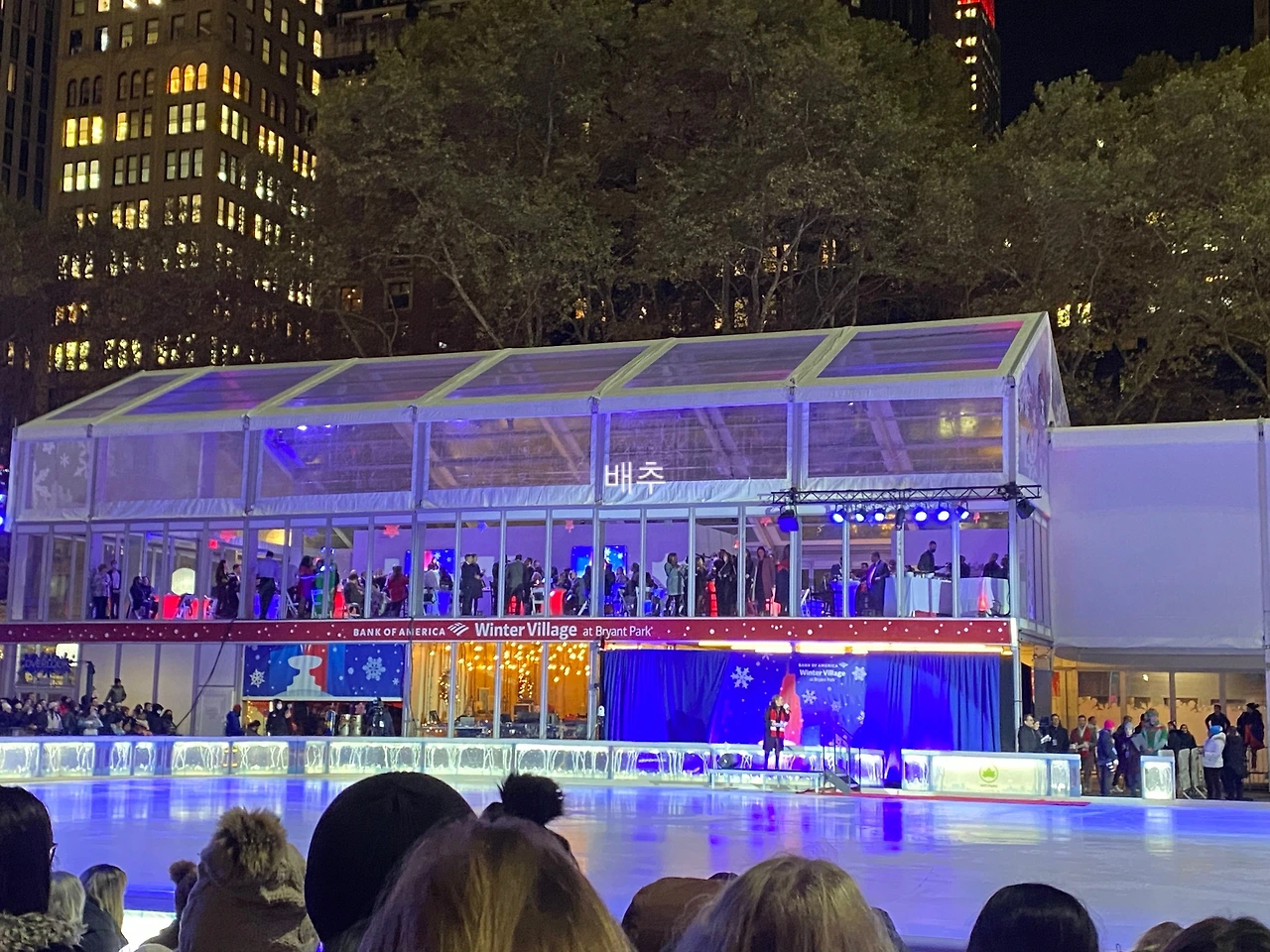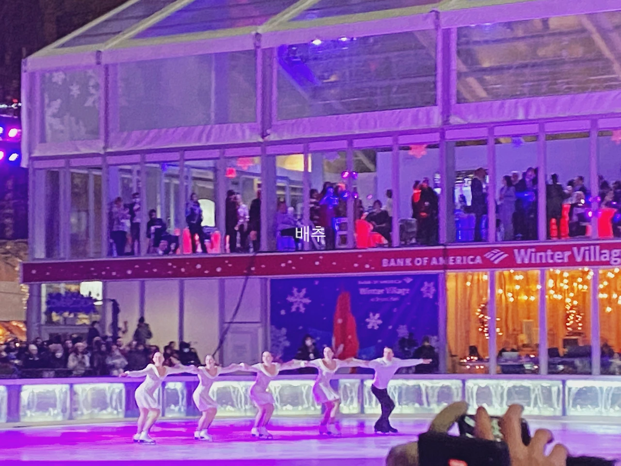 뱅크오브아메리카의 후원으로 만들어진 윈터빌리지는 스케이트장과 크리스마스빌리지로 꾸며져 있는데 무럭 아름답다. 그리하여 브라이언트파크의 트리라이팅에는 유명한 가수는 나오지 않지만, 아름다운 스케이트공연을 볼 수 있다. 메달리스트의 솔로공연에서, 단체공연까지 스케이터들의 동작들은 바로 눈 앞에서 볼 수 있어서 꽤나 신선하다. 대신에 공짜인 만큼 역시나 사람이 많아서 역시나 빨리 가서 자리를 선점해야 볼 수 있다. 그나마 나은 건 공연시간이 1시간정도라는 것이고, 소소하지만 트리라이팅과 함께 불꽃놀이도 이루어진다.