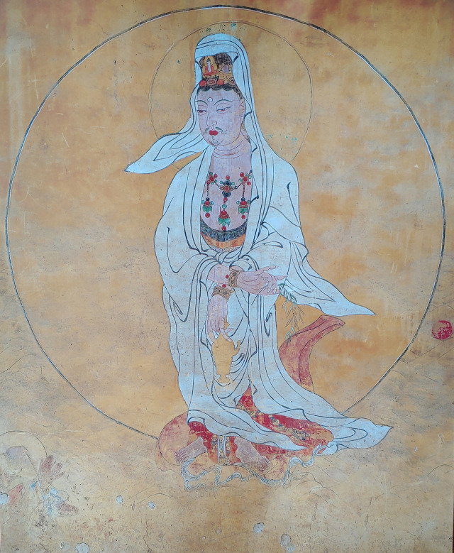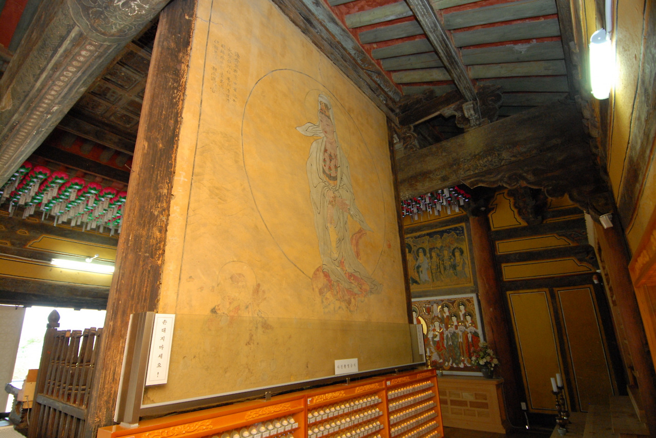 그런데 불교미술을 잘 모르는 순례자에겐 내부 벽에 그려진 백의관음도가 더 호기심을 자극한다. 조선 전기인 1476년쯤 제작된 것으로 추정되는 백의관음도 역시 나라의 보물이다.