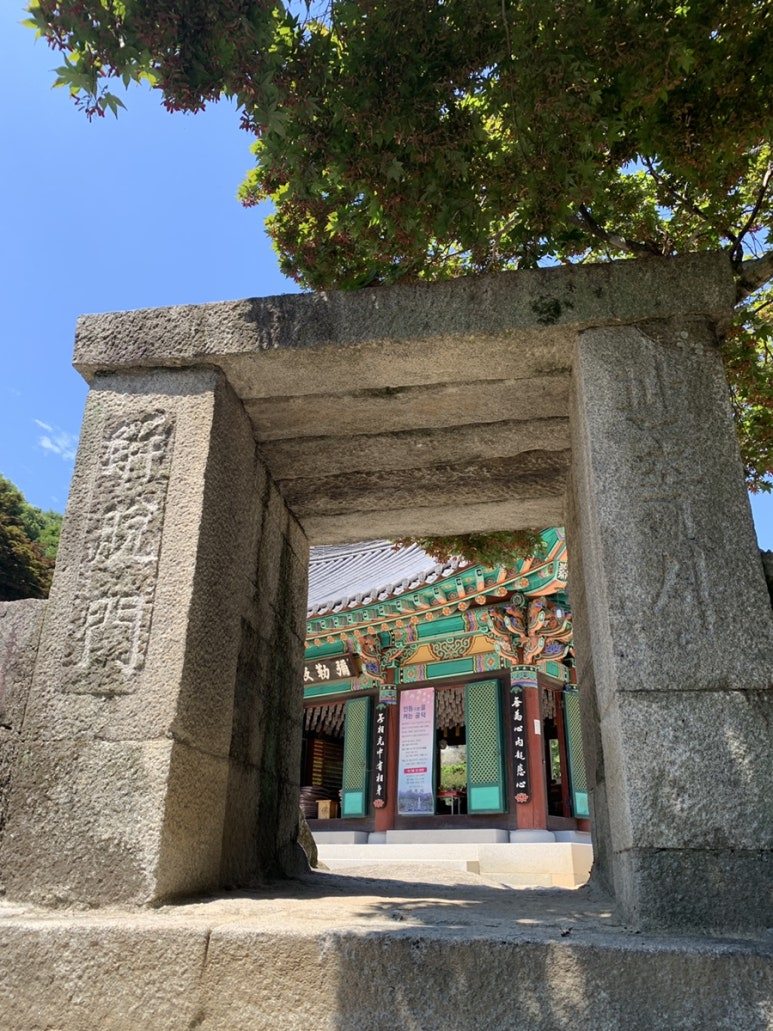 일주문을 지나 계단으로 경내로 올라갈 수도 있지만 오른쪽으로 가면 작은 돌기둥으로 된 석문이 나온다.
