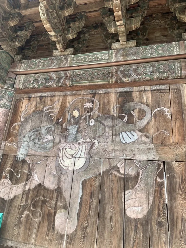 보광사 대웅보전 외벽화. 사자탄 문수동자와 코끼리 탄 보현동자