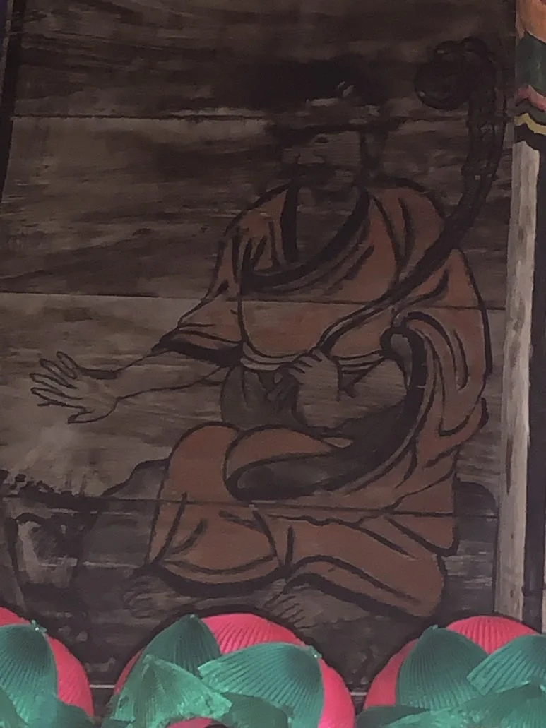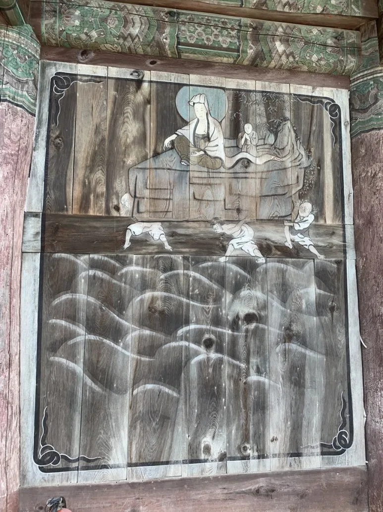 대웅보전 내부 불상 뒤 벽면에 있어 찾기가 쉽지 않지만, 해초를 타고 바다를 건너는 주황색 옷의 달마대사 모습이 무척 인상적이다.