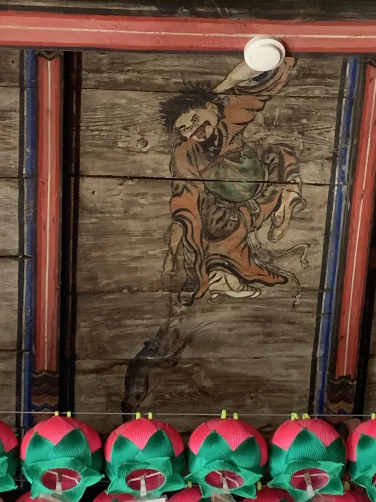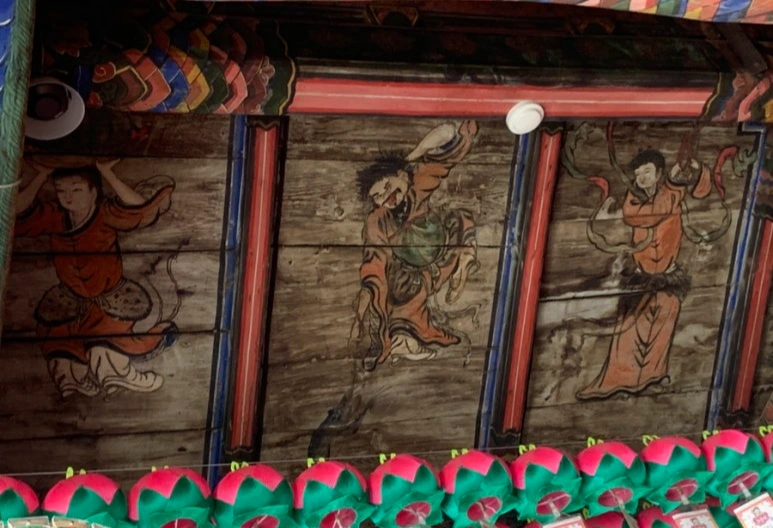 보광사 대웅보전 천장화. 한 선인이 두꺼비를 희롱한다.
