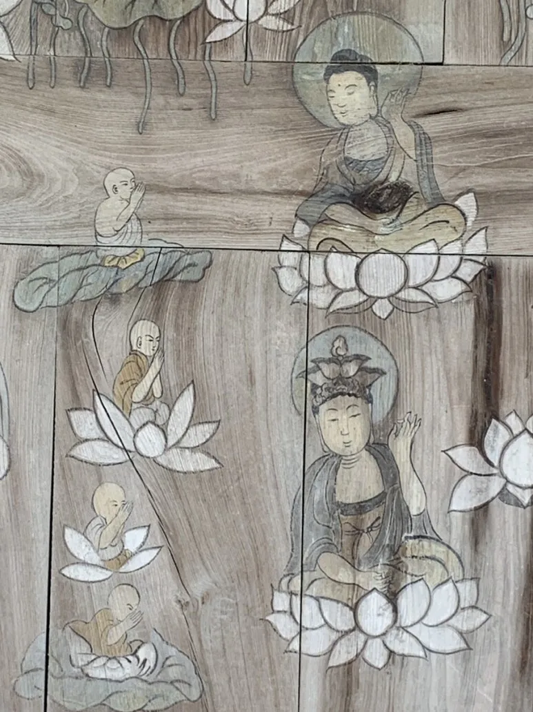 꽃비처럼 내리는 연꽃은 불교에서는 환생 혹은 재생을 상징한다고 한다. 거기에 타고 있는 인물도 볼살이 통통한 아기처럼 보이는데 요즘의 캐릭터처럼 친숙하다.