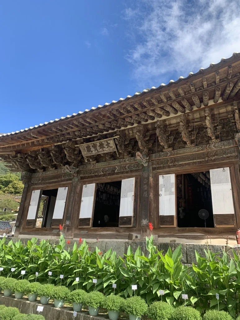 대웅보전 천장을 찬찬히 살펴보면 하늘에서 구름을 탄 선녀가 춤을 추고 내려오고, 피리를 불고 악기를 두드리는 동자의 모습도 찾아 볼 수 있다.