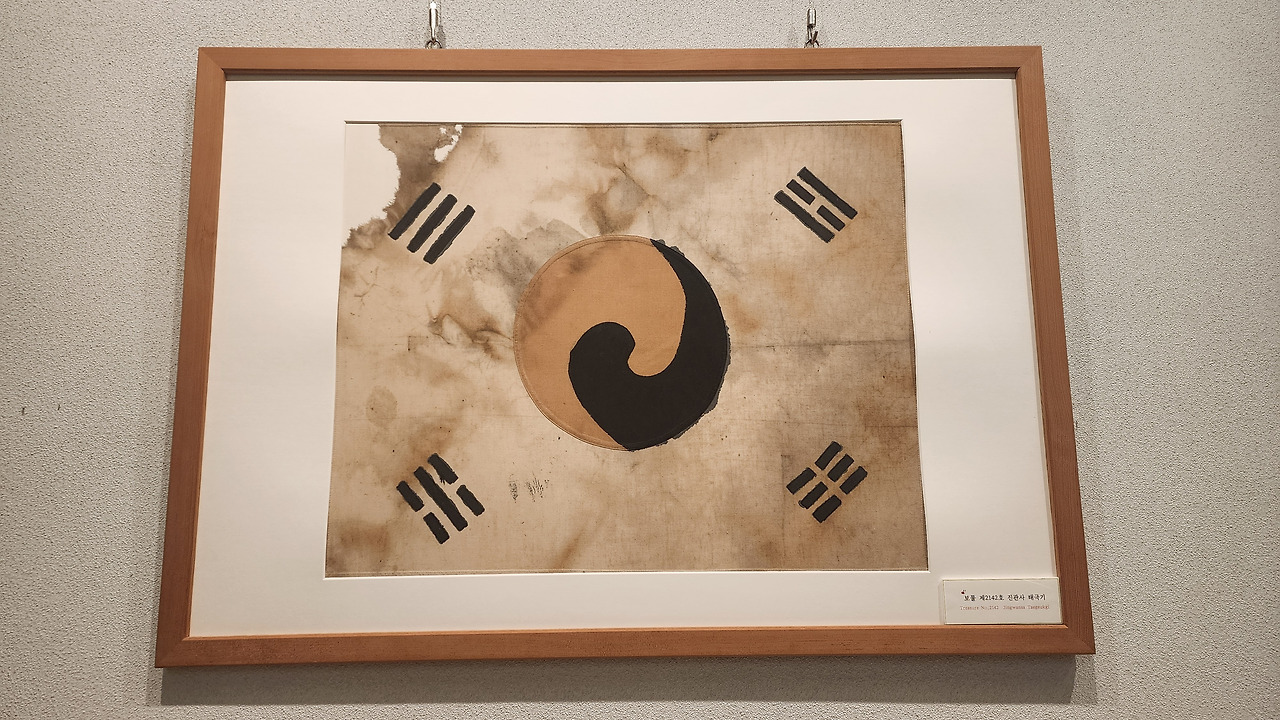 가로 89㎝, 세로 70㎝, 태극의 직경은 32㎝. 일장기 위에 태극무늬를 덧댄 태극기였다.