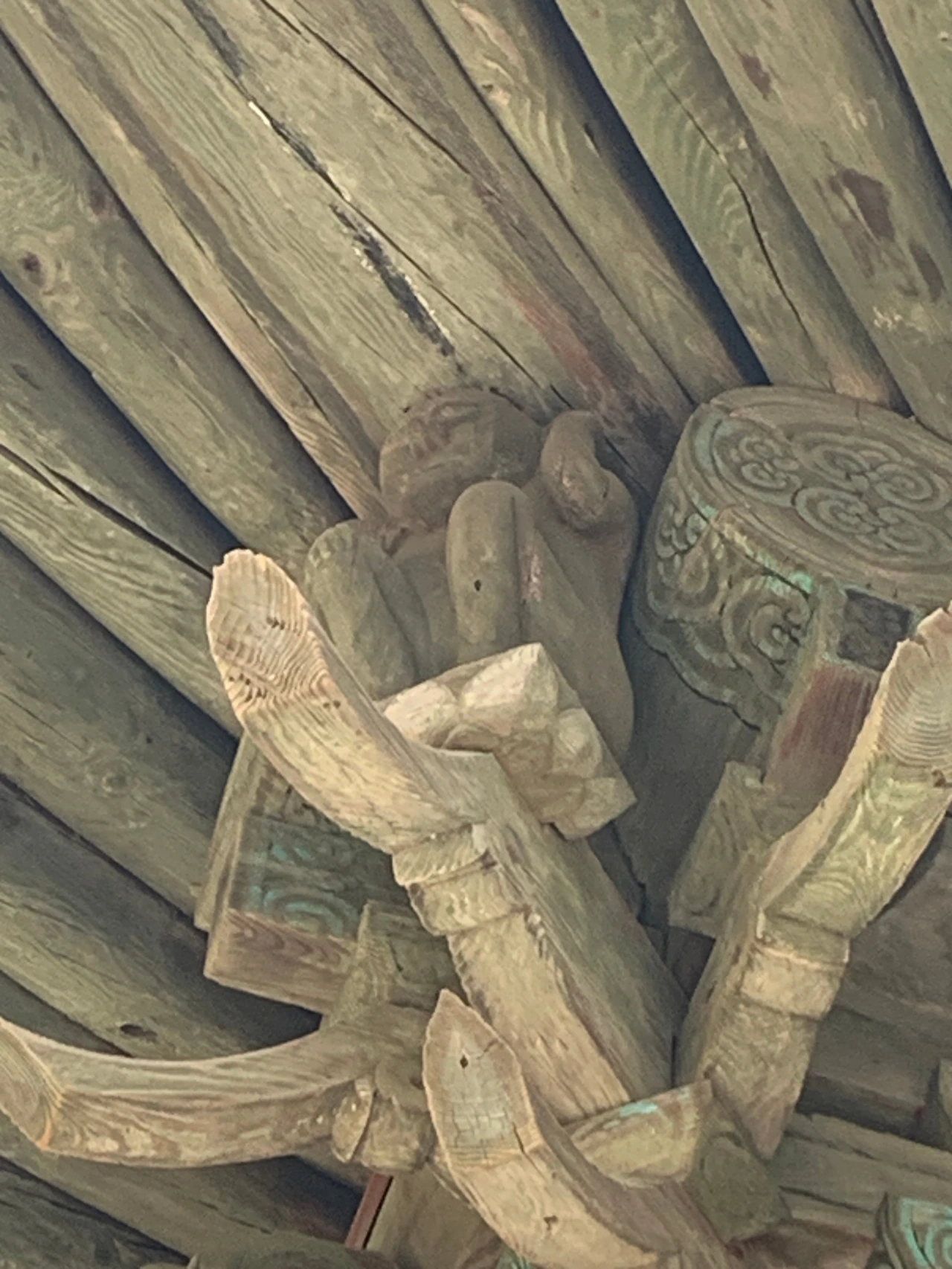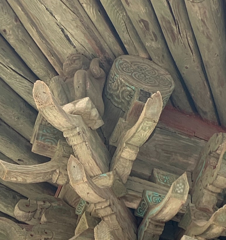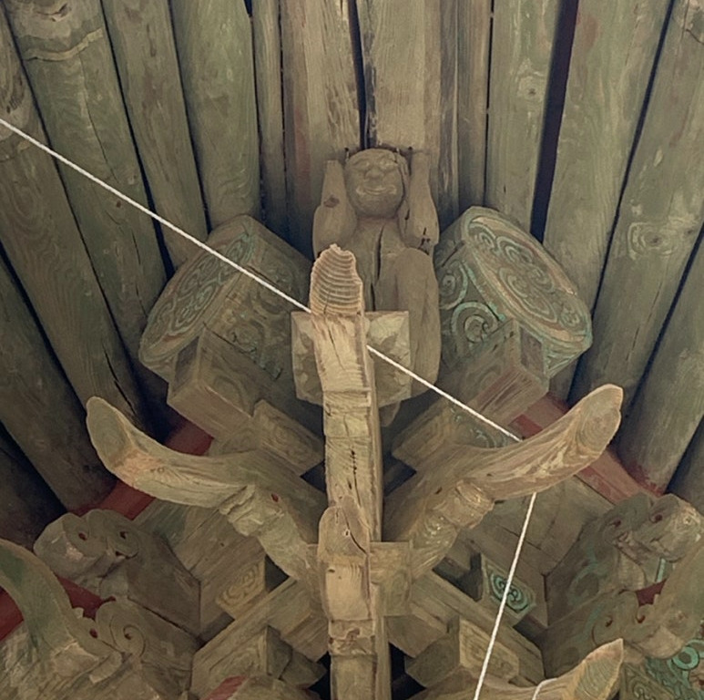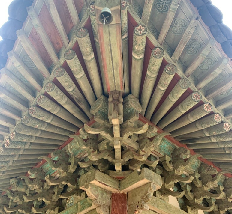 실제로 대웅보전 추녀 아래에는 두 손으로 지붕을 떠받친 2개의 조각상과 왼손으로 떠받치는 조각상, 오른손으로 떠받치는 조각상, 이렇게 모두 4개의 조각상이 네 귀퉁이에 있다.