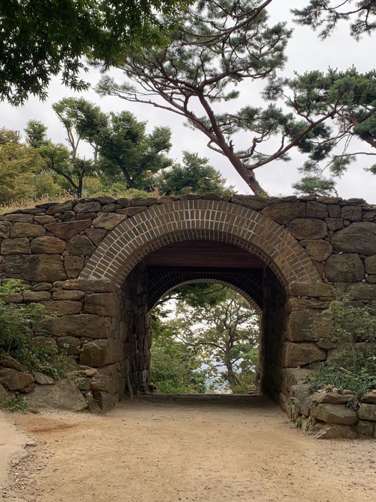 원숭이 왕 스토리를 뒤로 하고 삼랑성 동문 쪽으로 발길을 돌렸다. 무지개다리 형태의 동문이 좌우 성곽으로 길게 이어져 있다.