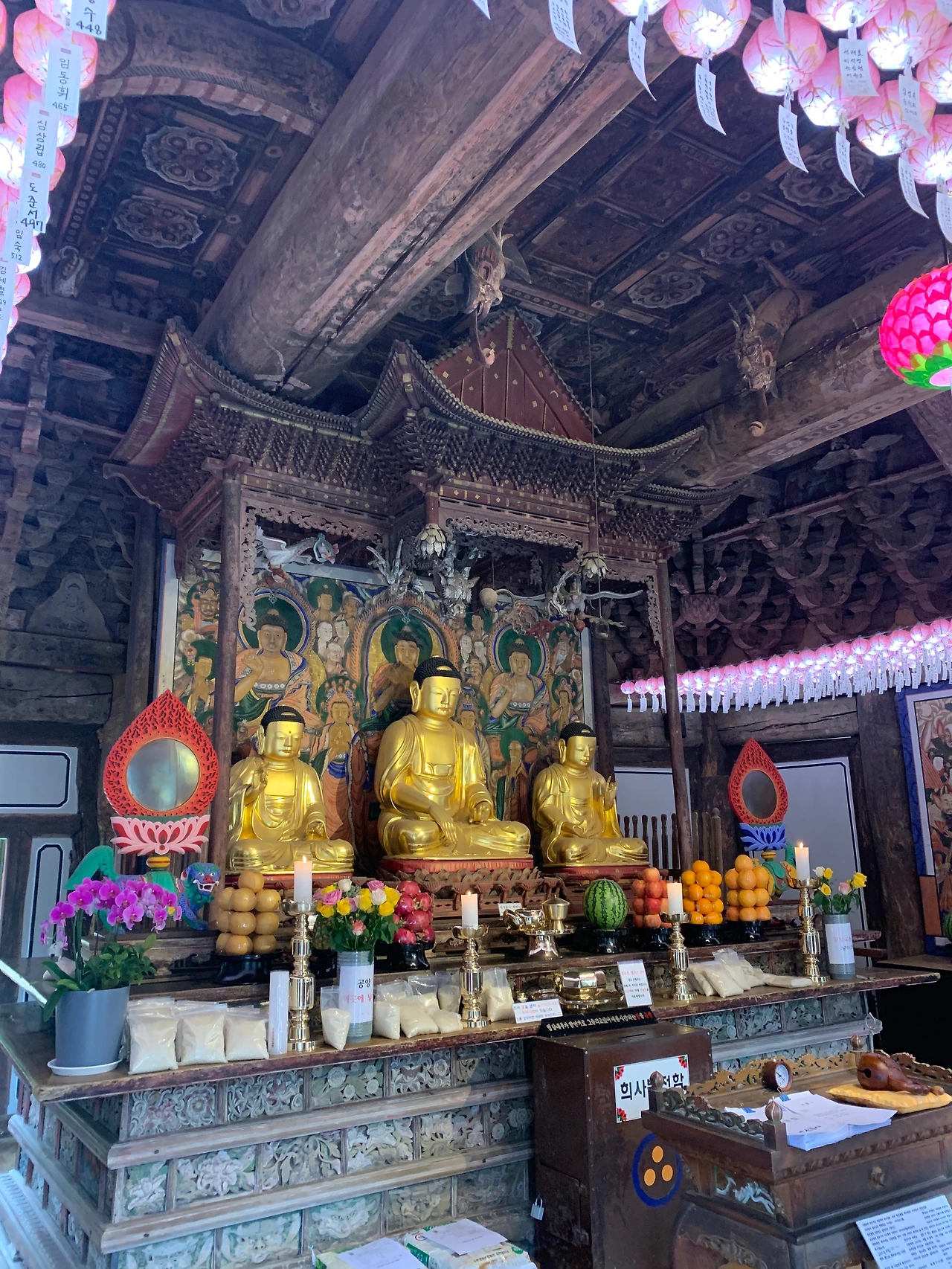 대웅보전 안에는 꽃을 물고 날아와 부처님께 예를 올리는 새들로 북적인다.
