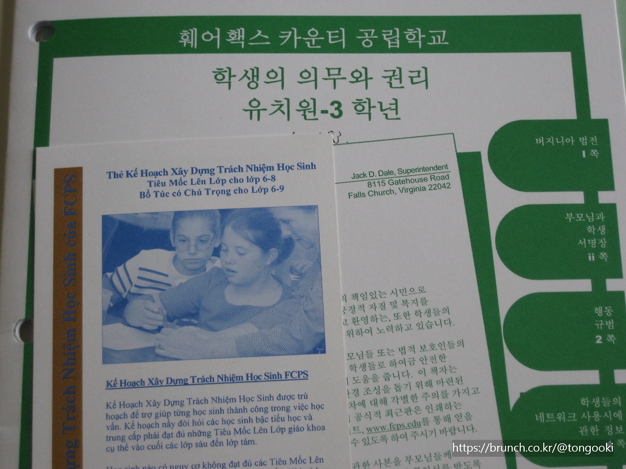 교육청에서 우리를 맞은 Multilingual Registrar는 50대로 보이는 교포여성이었는데 우리가 서류를 잘 준비했는지, 특히 버지니아 주 교육청에서 요구하는 건강진단서에 각종 예방 기록을 제대로 기입했는지, 또 의사의 서명은 있는지 등을 살폈으며, 부모가 서명해서 학교에 내야 할 서류에 대한 설명도 꼼꼼하게 해 주었다.