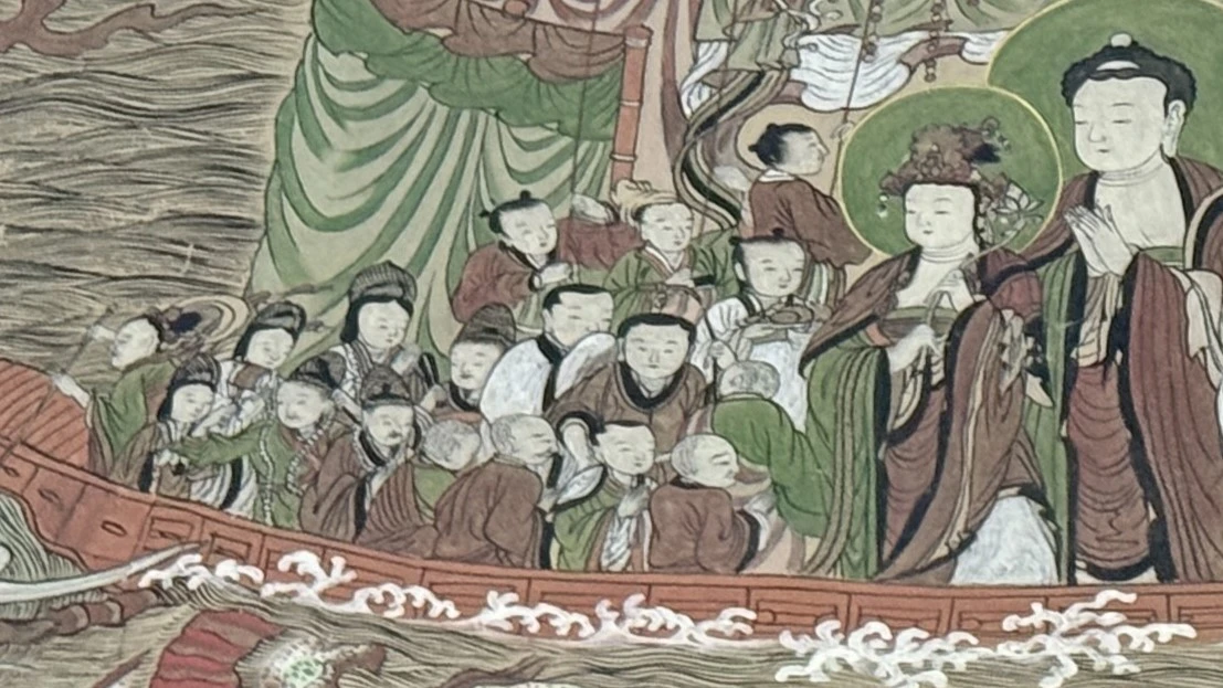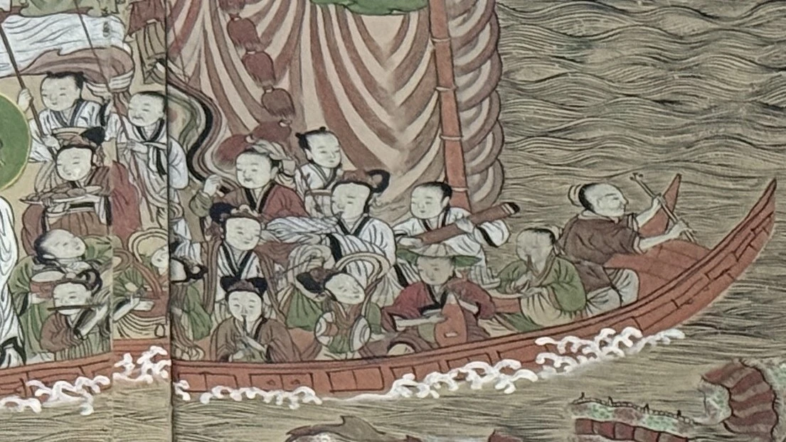 또 머리에 망사를 두르거나 목에 굵은 염주를 건 사람들이 탑승해 있다. 한 사람은 작은 북을 머리 위로 들고 있으며 배 뒤쪽에서는 피리나 거문고 같은 악기를 연주하는 모습도 발견된다.