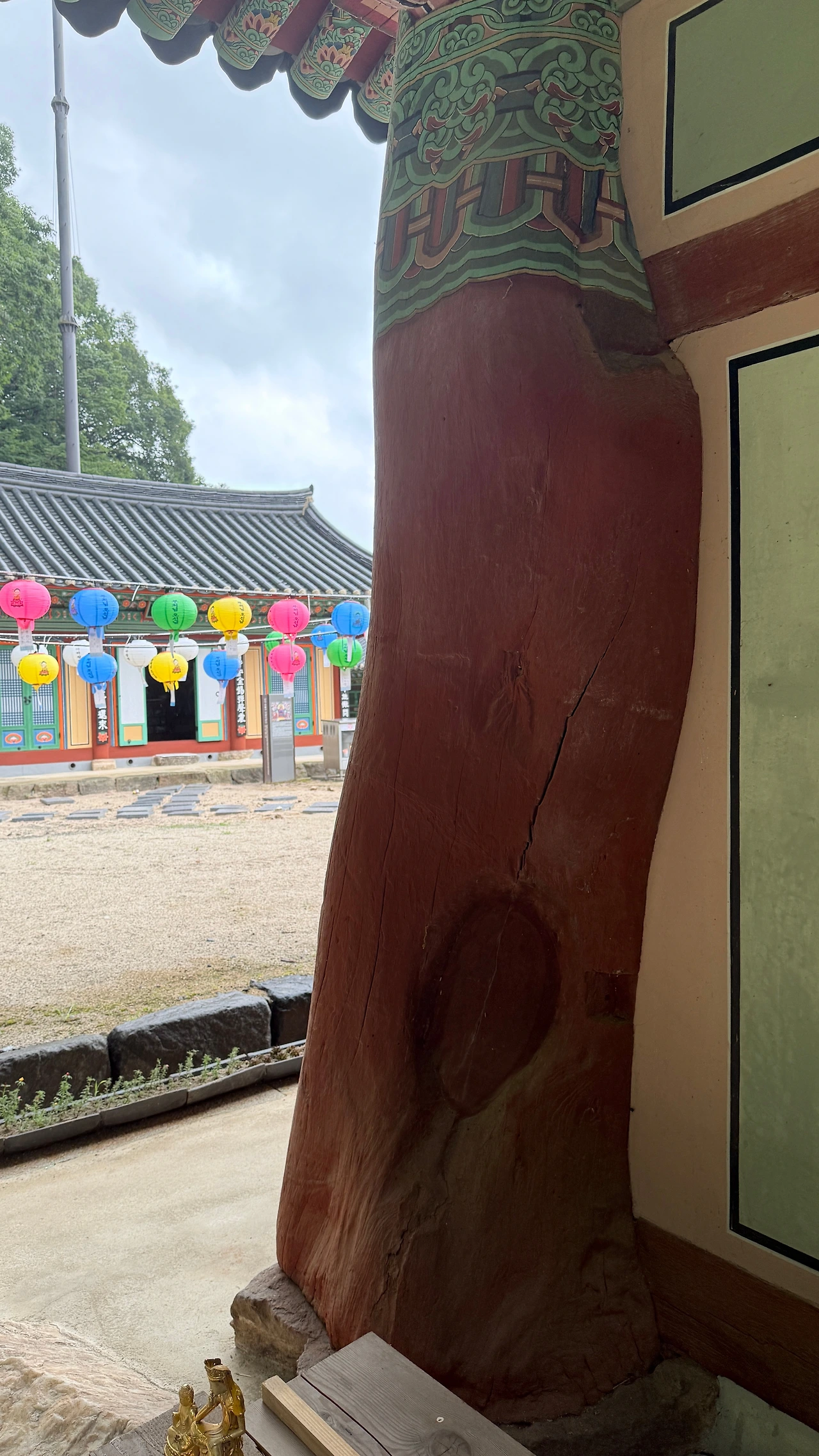 이 정도 크기라면 곧고 반듯하게 재단해서 사용할 수도 있었을 텐데 오히려 원형을 그대로 살린 것이다. 대웅전을 빙 돌아 받치고 있는 열 다섯 그루 나무의 숨결이 그대로 묻어나는 듯 했다.
