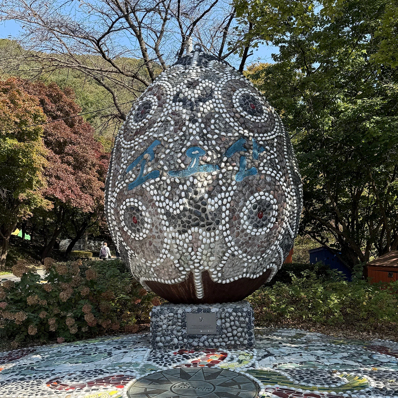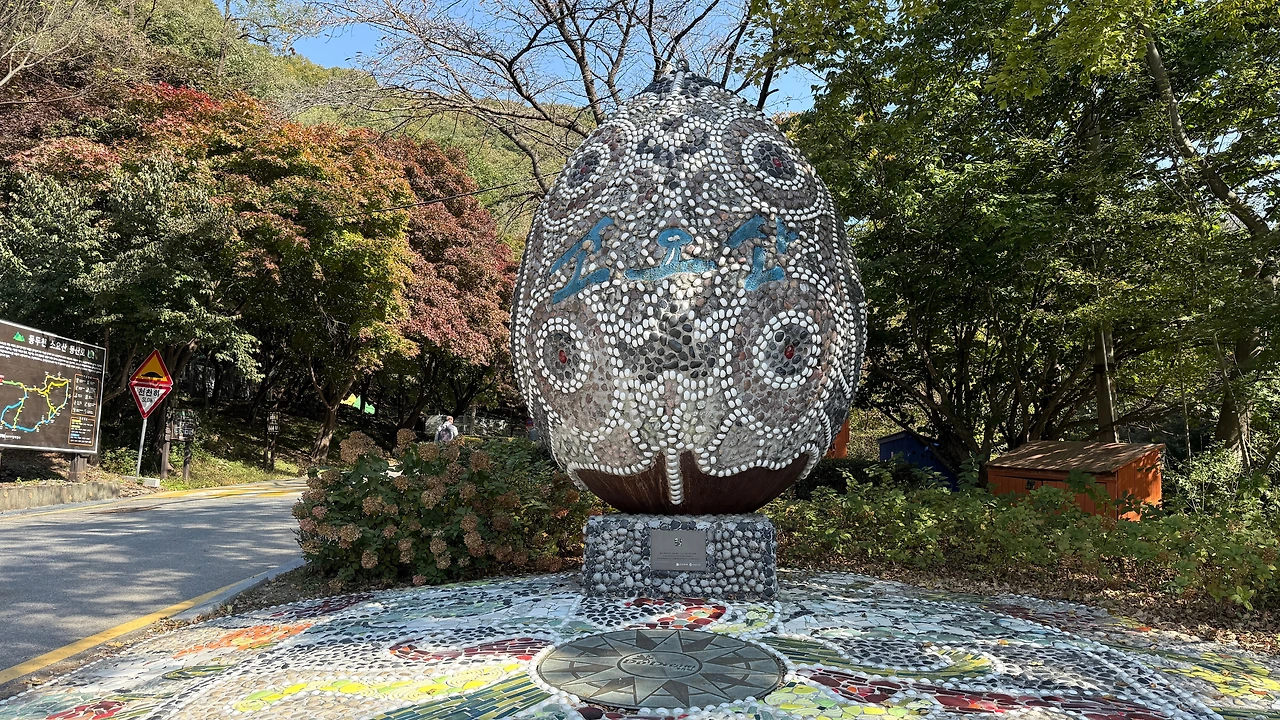 등산로 입구에 알 모양의 독특한 조형물이 서 있다.