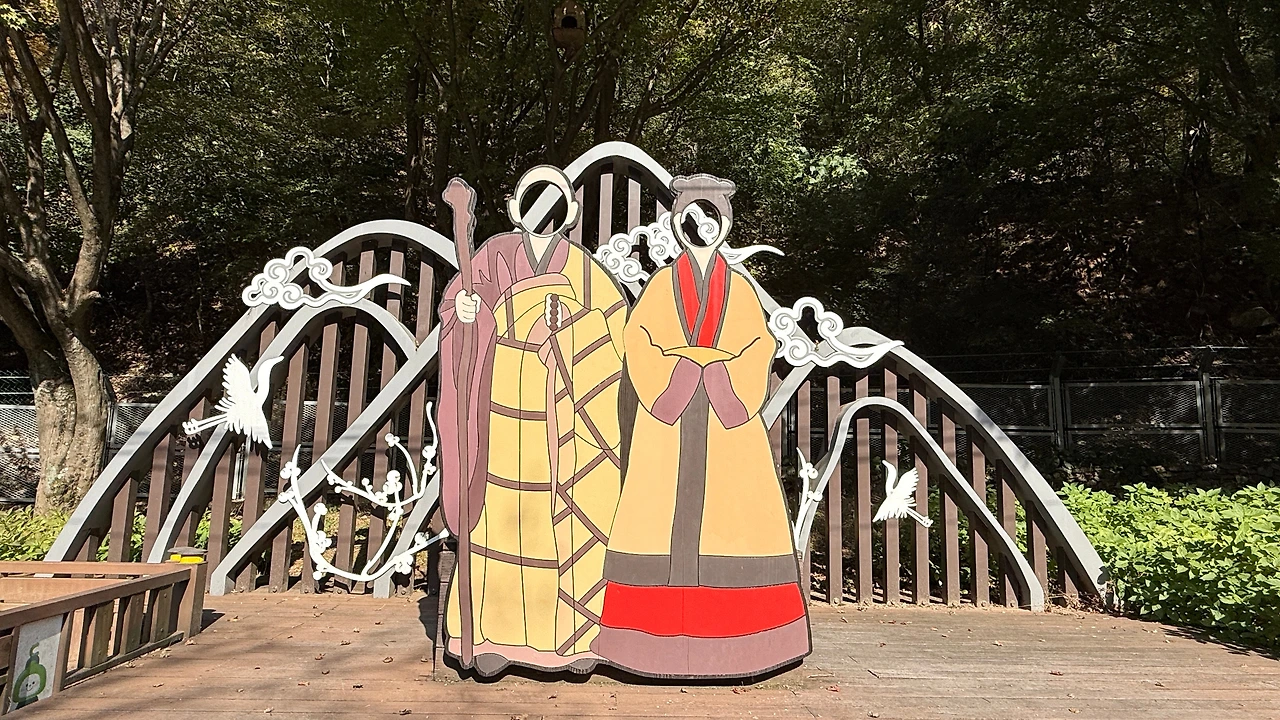 가을 풍광을 눈에 담으며 올라가는 데 얼굴 부분이 뚫려있는 스님과 여인 모습의 사진대가 보인다.