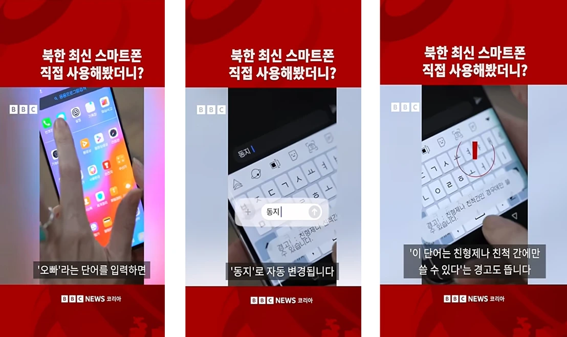 “BBC 취재진이 북한에서 밀반출된 스마트폰에 한국어로 ‘오빠’를 입력하려 하자, ‘동지’라는 단어로 자동 수정됐다. 동시에 ‘오빠’는 ‘친형제나 친척 간인 경우에만 쓸 수 있습니다’라는 경고 문구가 나왔다.