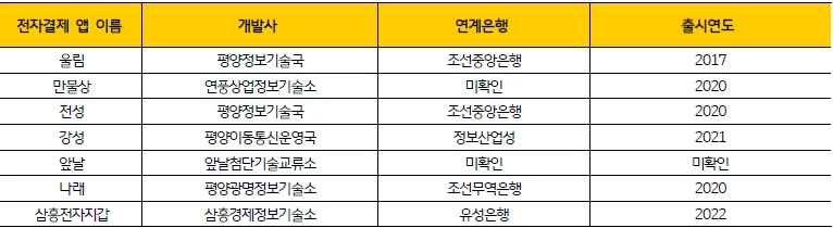 북한에서 가장 많이 사용되는 전자결제 앱은 ‘삼흥전자지갑’이고, 울림, 전성, 나래 등 다양한 전자결제 앱이 존재한다. 이들 앱은 유성은행, 조선중앙은행, 조선무역은행 등과 연계돼 있다.