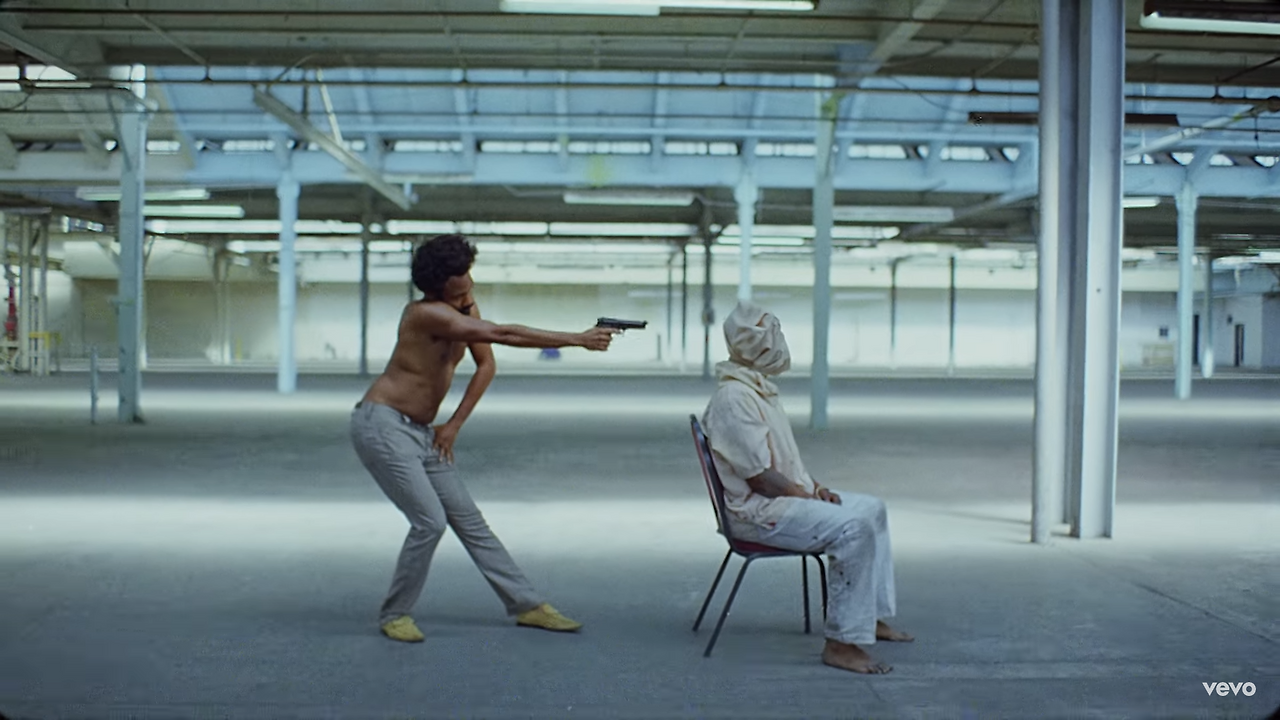 방금까지 기타를 치던 흑인 남자의 얼굴에 두건이 씌워지고 감비노는 괴상한 자세로 그의 머리를 향해 총을 쏜다. 곧바로 그가 내뱉는 말이 보는 이들을 아득하게 만든다. "This is America."