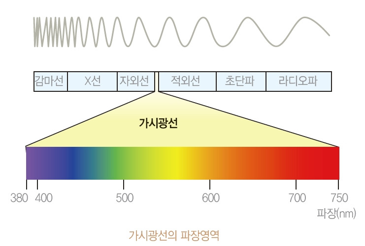 대상을 볼 수 있다는 것은 그 대상에 닿아 반사된 빛을 통해 형태와 색상, 밝기, 분위기 등을 시각적으로 파악하는 것이다. 눈으로 볼 수 있다는 것은 사람이 보고 판단과 이해를 할 수 있는 빛이 존재한다는 것이며, 명암(밝고 어두움의 차이)과 색상 등을 인지한다는 것은 빛이 대상의 고유색을 함께 반사시킨 그 농도와 색상을 보고 두뇌가 판독하는 것이다. 이렇게 눈으로 보고 인지할 수 있는 빛을 가시광선(Visible Rays)이라 하며 바로 태양광이 대표적인 가시광선이다. 가시광선을 분광기를 통해 확인한 파장의 범위는 약 400~700nm(나노미터, 1nm는 100만 분의 1mm) 정도이다. 이 범위 중에서 450nm 근처의 파란색(Blue), 530nm 근처의 녹색(Green), 700nm 근처의 빨간색(Red)을 지닌 영역이 우리 눈으로 식별할 수 있는 색상 표현 범위이며 가시광선을 대표하는 빛의 3 원색이라고도 한다. 물론 이 범위는 보라, 남색, 파랑, 초록, 노랑, 주황, 빨간색의 눈으로 확인 가능한 모든 색상을 구현한다. 빛이 대상에 닿아 반사와 굴절로서 강약과 색상을 머금어 렌즈 안으로 들어와 기록될 때, 우린 색상이 화려하다, 화창하고 맑은 날씨라 기분이 좋다 등의 감성적 느낌을 영상에서 얻게 된다.