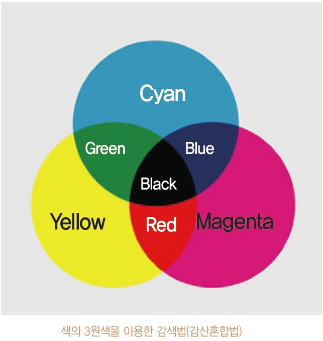 빛의 3 원색을 합쳐 만든 2차 색인 노란색(Yellow, Y), 마젠타(Magenta, M), 사이안(Cyan, C)을 빛의 2차 3원 색인 색의 3 원색이라 한다. 색의 3원 색인 Y, M, C를 사용하여 또 다른 색을 만들어내는 방법을 감색법(감산혼합법)이라 한다. 감색법은 두 가지 이상의 색 재료 즉. 잉크나 물감, 염료 등에서 색의 3 원색 중 하나의 색을 매질(재료)에 흡수(착색)시켜 그 색 외에는 반사 또는 투과하지 못하게 하여 여러 가지 다른 색을 만들어내는 혼합법이다.