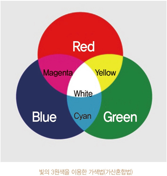 빛의 3원 색인 B, G, R 각각을 여러 광량의 밝기와 색상으로 비춰 합하면 거의 무한대의 다양한 색을 만들 수 있다. B, G, R의 대표색 중에서 두 개 또는 세 개 이상의 색상을 여러 가지 비율로 섞어 다른 색상을 만드는 방식을 가색법(가산혼합법)이라고 한다. 빛을 혼합하여 색상으로 만드는 것으로서 녹색과 빨간색을 섞으면 노란색(Yellow)이, 빨간색과 파란색을 섞으면 마젠타(Magenta)가, 파란색과 녹색을 섞으면 청록의 사이안(Cyan) 색상이 나타난다. 게다가 빛의 3원 색인 B, G, R을 최대의 강도로 모두 섞으면 흰색(사실은 무색투명)이 된다.