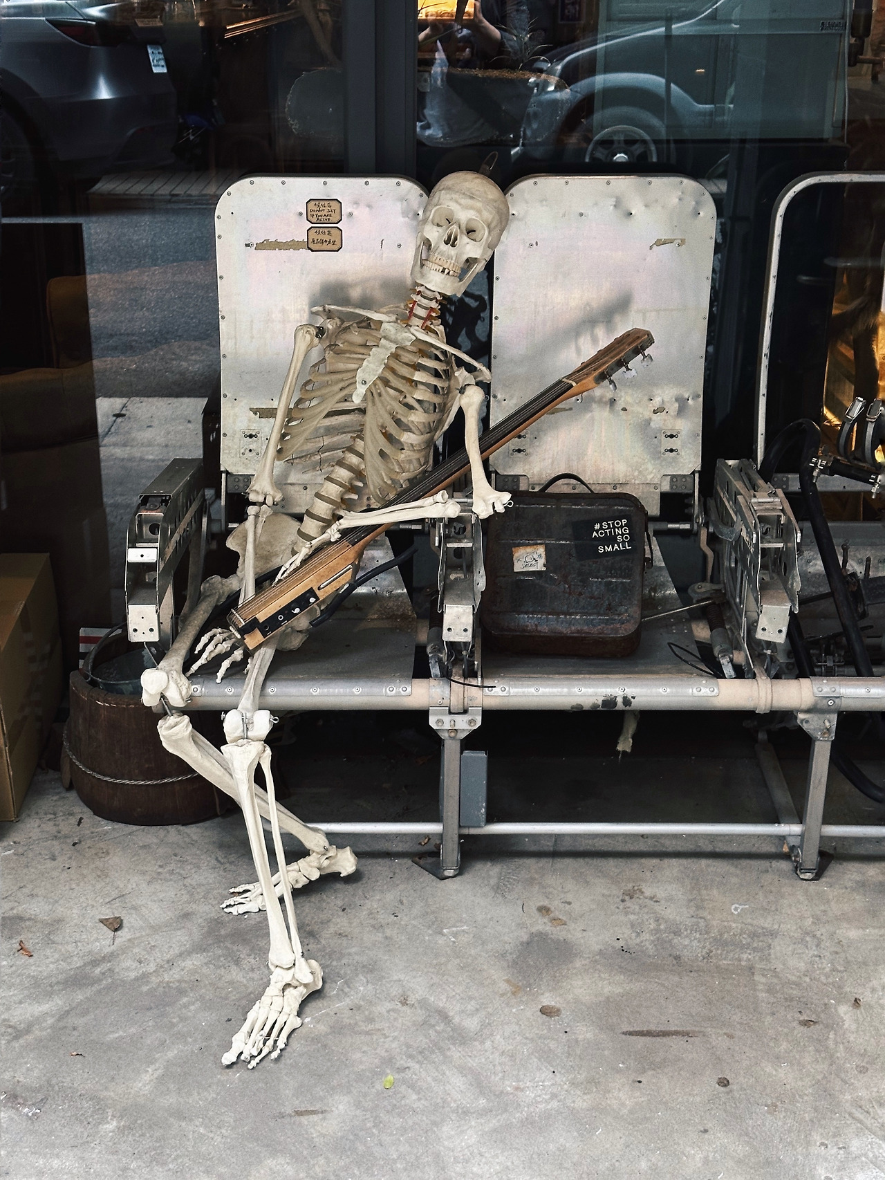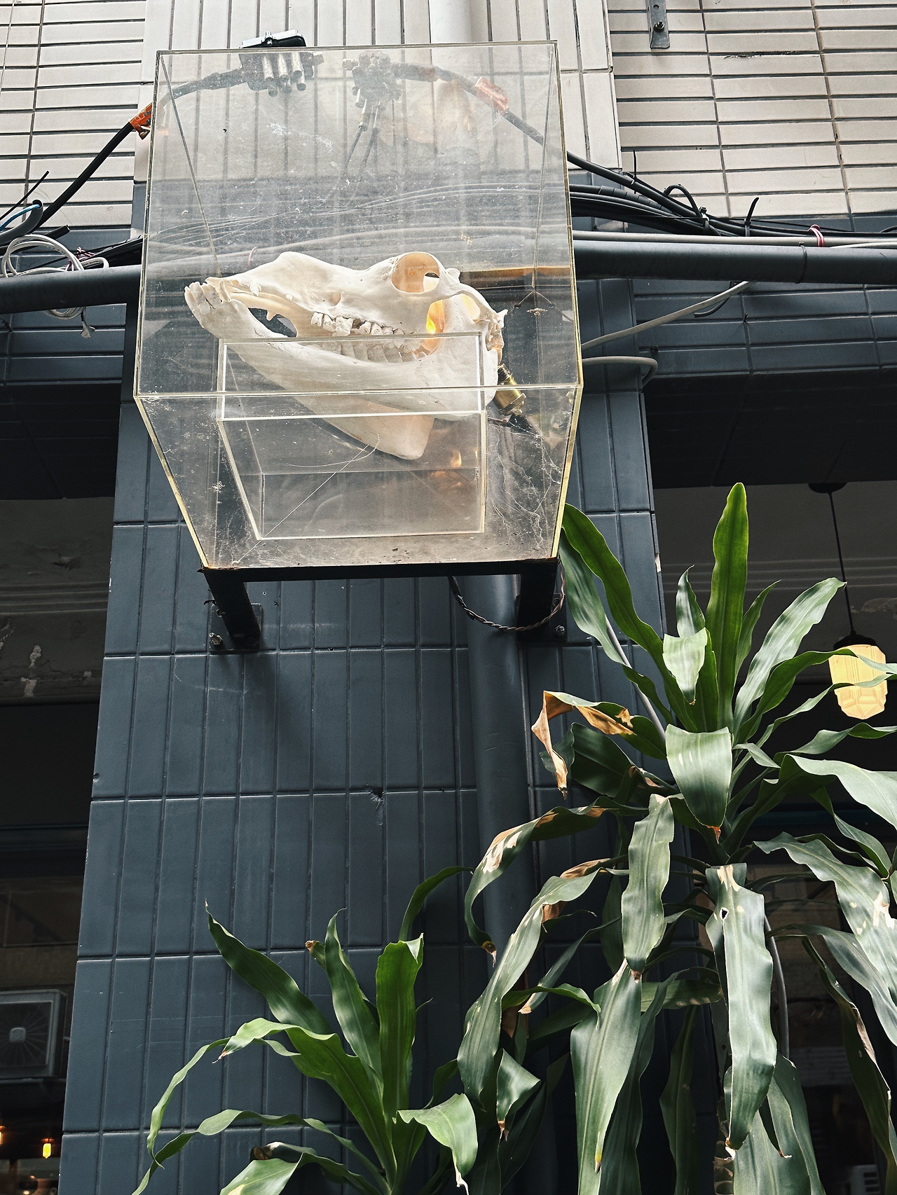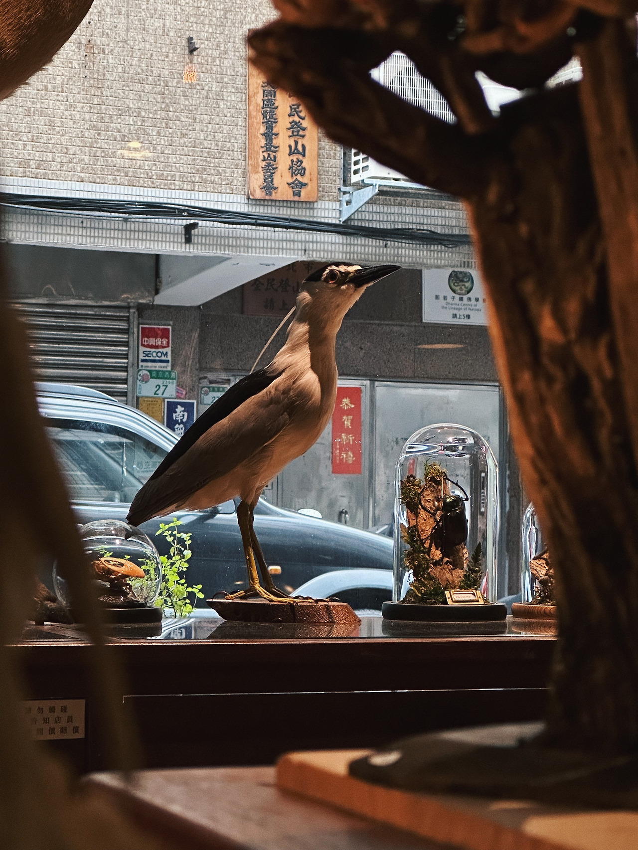번역하면 '철새 저장소 카페'라고 나온다. 전통거리 디화제 근처에서 미션 수행을 하다 발견한 듣도 보도 못한 카페다. 간판자리에 떡하니 붙어 있는 동물 머리뼈... 그 아래엔 해골이 기타를 치고 앉아 있다. 창을 기웃거려 보니 충격적인 비주얼이 펼쳐졌다. 온통 박제로 가득한 공간.. 어둡고 그로데스크 한 분위기가 조금 무서웠지만, 내가 누군가. INTJ다. 미션을 수행하러 왔으면 해야 한다.