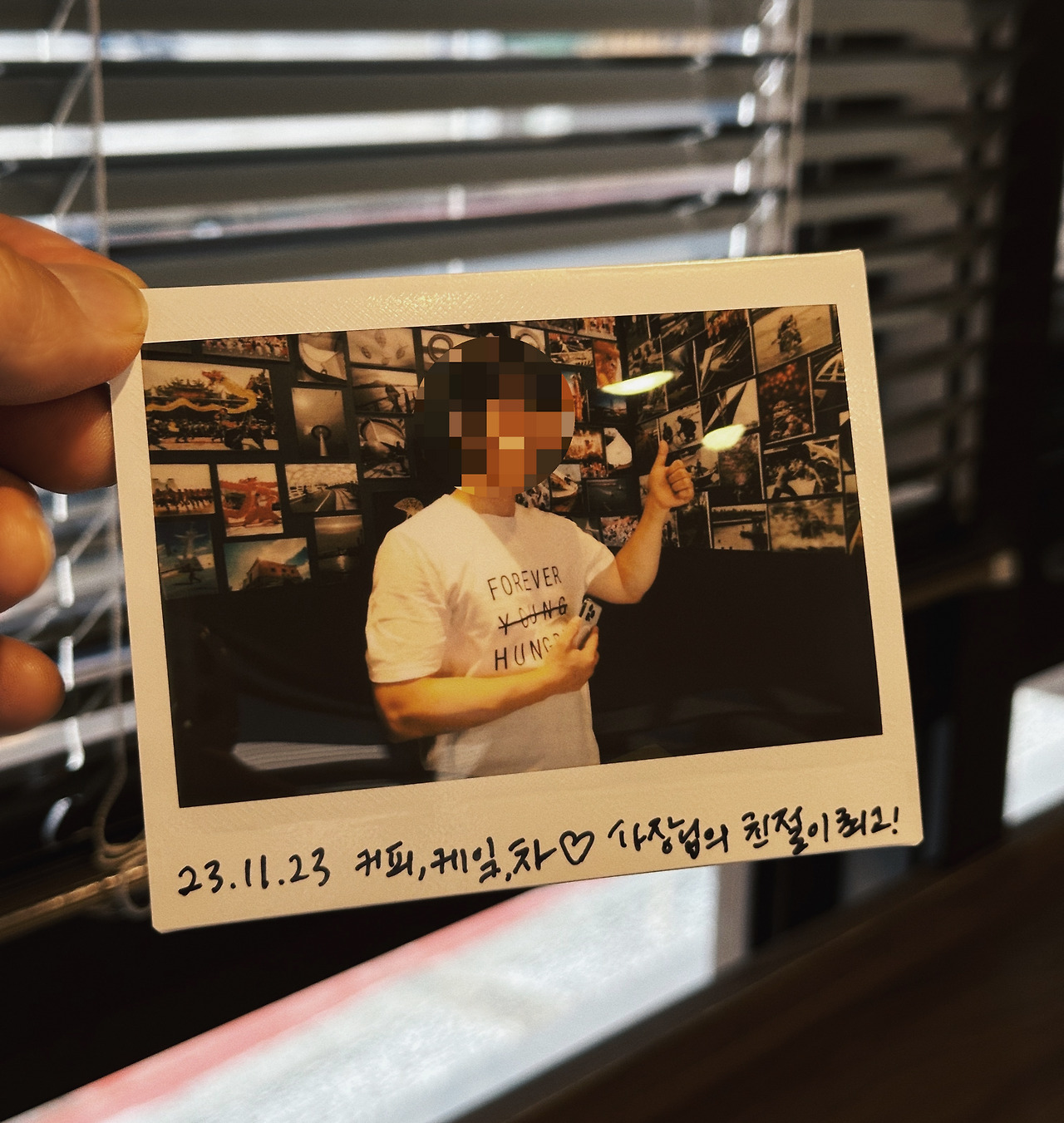 벽에 방문한 손님들의 즉석 사진과 코멘트를 붙여 놓으셨는데, 나에게도 부탁하셔서 부끄럽지만 나의 흔적을 남기고 왔다.