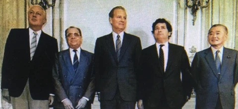✲ 플라자 합의(Plaza Accord) : 1985년 미국은 막대한 대미 무역수지 흑자를 내고 있던 일본을 견제하기 위해 일본 재무장관을 뉴욕의 플라자 호텔로 불러들입니다. 함께 모인 프랑스, 독일(서독), 영국, 미국의 재무장관들은 더 이상 저평가된 엔화가 누리는 혜택을 좌시할 수 없다며 엔화를 평가절상(돈의 가치를 올림)시켜 버립니다. 말이 합의지 거의 강제였습니다. 일본은 패전국 트라우마로 순순히 따랐습니다.
