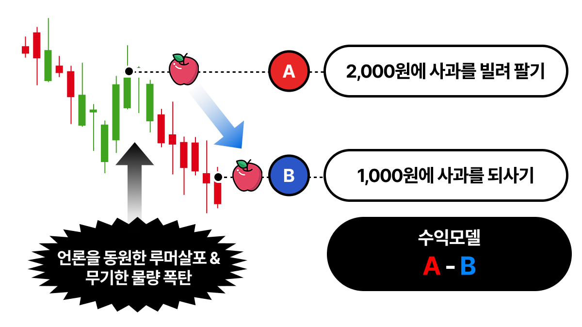 공매도 세력이 농부에게 사과를 빌려서 시장에 내다 팝니다. 이를 숏이라 합니다. 사과 농사에 참여하거나 보유하지 않고도 일단 2,000원이 수중에 들어옵니다.