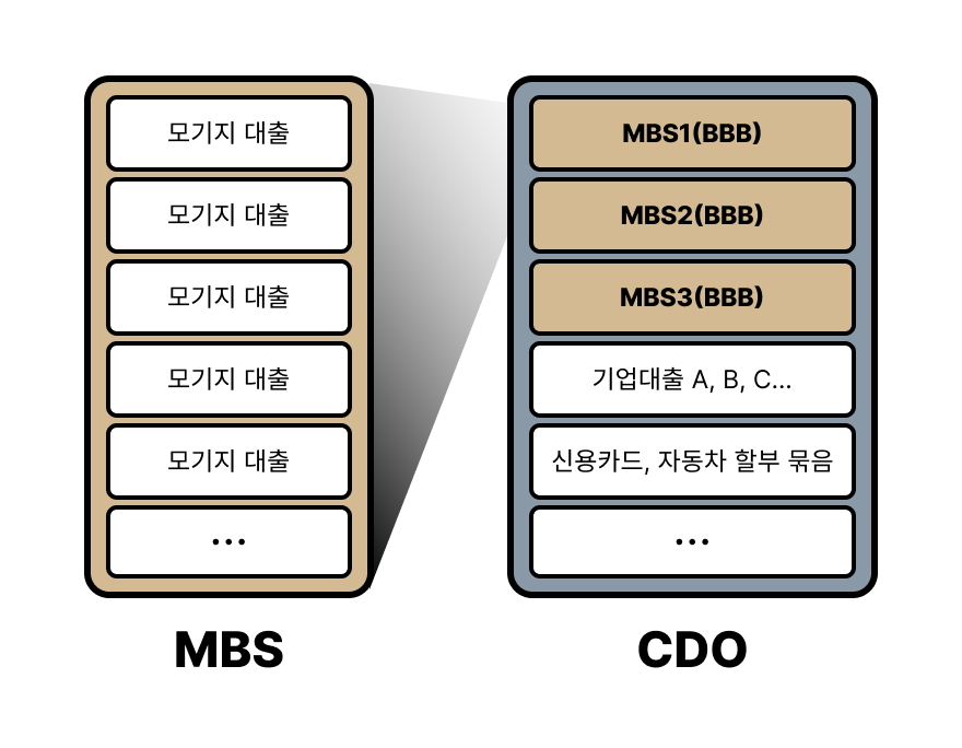 MBS는 1차 파생상품, CDO는 그걸 바탕으로 만든 2차 파생상품입니다.
