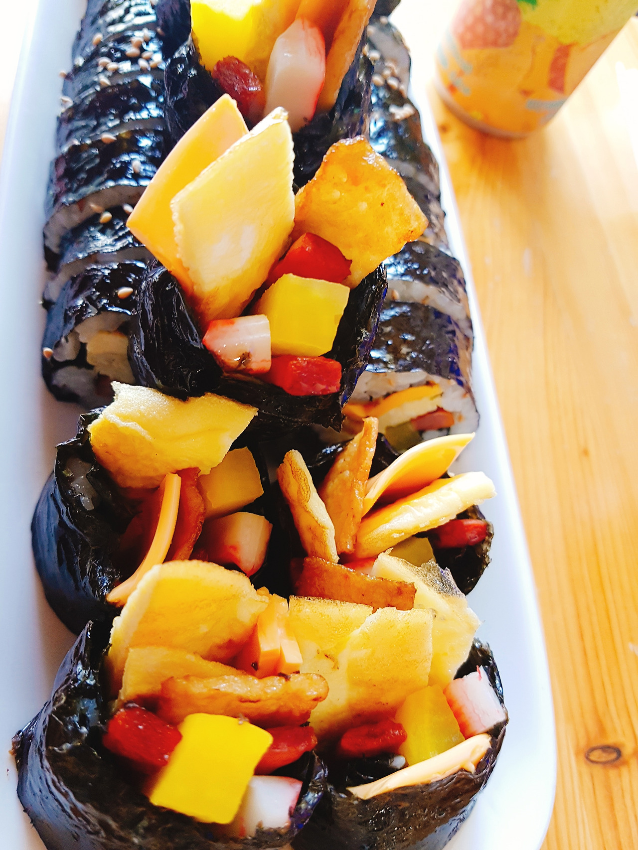 참치김밥 위에 이지 치즈(액체형 스프레이)도 토핑처럼 올려보고, 고다치즈도 넣어보았다.
