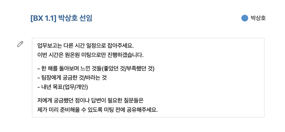 이번 1on1 미팅은 지난 9월 이후 두달 만에 진행되었다. 그동안 일도 바쁘고 사내 행사들이 겹쳐 미뤄왔었다. 지난 미팅을 마치고, 공백기를 가질 것이라고 결정한 팀장님은 모든 팀원들에게 일일이 긴 글의 메일을 보냈다. 그 내용은 1on1 미팅에 대한 리뷰였고, 나 개인의 성장을 위한 업무적/커리어적 피드백과 조언이었다. 같이 일하는 팀장님께 감동받은 건 그때가 처음이었다. 이번 1on1 미팅을 준비하면서 두 달 전에 받은 그 메일을 다시 열어봤다. 그리고 천천히 답을 적어 나갔다. 답장은 점점 지난 1년간의 회고가 되고, 회고는 점점 반성문이 되어갔다.