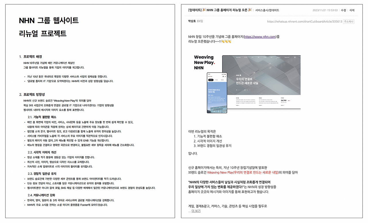 우리는 기업 웹사이트를 작업했고, 그 기업에 속한 사람들은, 달리 말하자면 클라이언트나 다름 없었다. 또 한 편으로는 아주 가까이에 있는 동료들이기도 했다. 이들이 우리의 의도를 이해하고, 납득하고, 프로젝트를 좋은 방향으로 바라봐준다면 그걸로 절반은 성공한 게 아닐까? 하는 마음으로 사내 인트라넷에 처음으로 게시글을 남겼다.