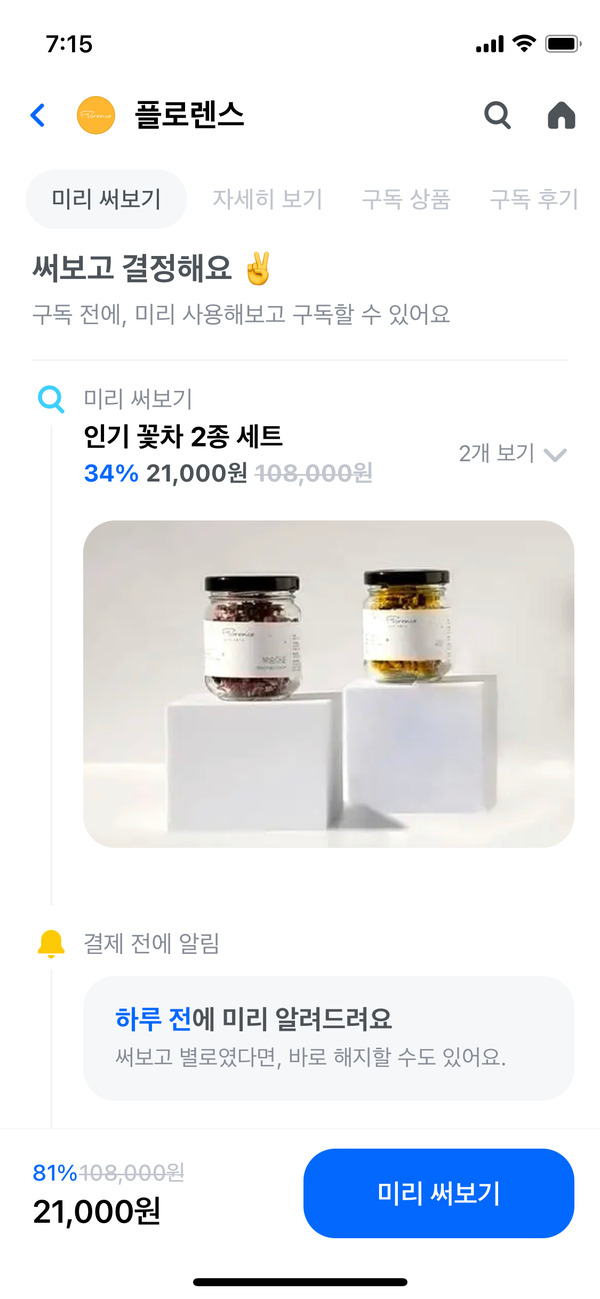 미노이의 티타임에 딱 어울리는 구독서비스 역시 왓섭에 있다. 바로 왓섭X플로렌스 꽃차 구독이다. 동백꽃과 복숭아꽃, 메리골드꽃, 아카시아꽃 등 병에 담긴 꽃차들은 보기만 해도 예쁘지만, 뜨거운 물을 붓는 순간 향기까지 더해지면 얼어있던 몸과 마음도 산뜻하게 녹일 수 있다.