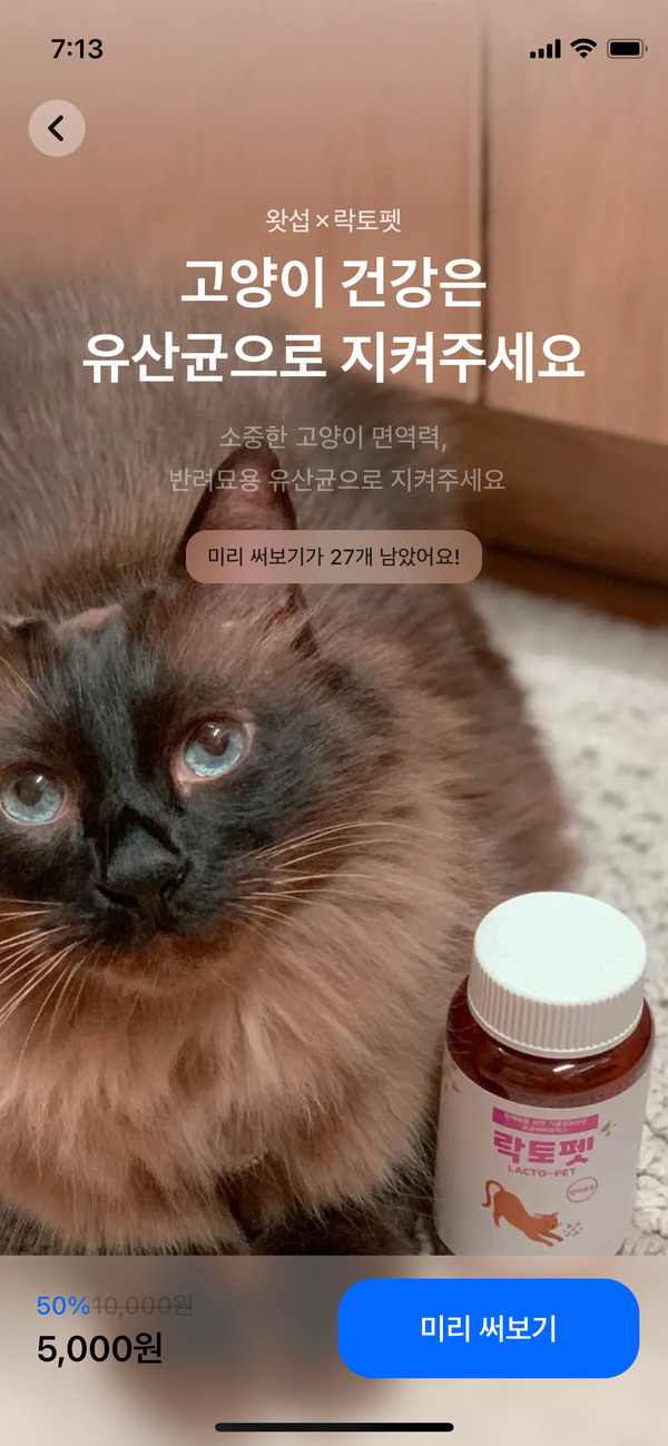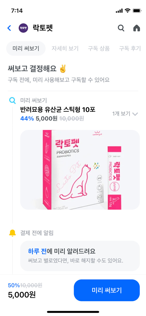 실제 반려묘 2마리를 키우는 펫팸족 미노이를 위해 준비한 건 고양이 유산균 구독 서비스이다. 장내 유해균을 줄여 소화 기능을 개선하고, 면역 강화 효과도 볼 수 있는 아이템이다. 왓섭X락토펫 고양이 유산균은 스틱형과 용기형 중에 선택해 구독할 수 있다. 스틱형은 외출 시, 용기형은 집 안에 두고 먹이기 좋다.