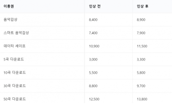 지니뮤직 회원이 구글 인앱결제를 통해 구매하는 이용권은 ‘음악감상'과 ‘스마트 음악감상'이 대표적이다. 두 이용권 요금제는 각각 8400원에서 8900원으로, 7400원에서 7900원으로 500원씩 올랐다. 이 밖에 ‘데이터 세이프'와 5~50곡의 다운로드 서비스를 제공하는 이용권도 10% 안팎의 인상률을 보이고 있다.