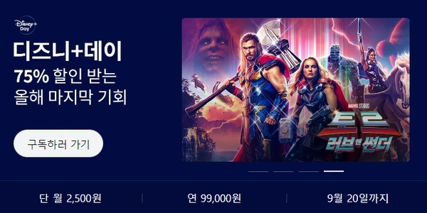 2,500원 할인 가격은 딱 1달만 유지되는데, 한 달이 지나면 등록된 결제수단으로 자동 갱신되어 결제가 이뤄진다. 한 달이 지나기 전 해지하지 않으면 매달 기존 정가인 9,900원이 결제될 것이다. 일단 한 달 동안 디즈니플러스 콘텐츠를 충분히 감상해보고, 이후 구독과 해지 중 선택하는게 현명하겠다. 실사 영화 '피노키오'와 '토르: 러브 앤 썬더' 등 최신 작품 몇 편만 봐도 남는 장사라고도 할 수 있을 것!