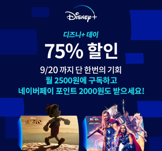 디즈니플러스데이 이벤트를 진행하고 있다. 신규 구독자라면 첫 달 2,500원, 네이버페이 이벤트까지 활용하면 500원에 디즈니플러스를 즐길 수 있다.