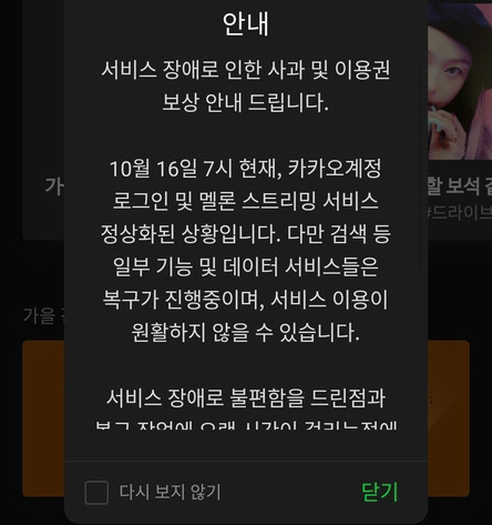 카카오 오류 관련해 웹툰과 음악 스트리밍 서비스도 차질을 빚었다. 16일 카카오 웹툰은 모든 서비스가 복구됐고, 멜론의 경우도 로그인 및 음악 감상 기능이 정상화된 상황이다. 카카오 웹툰은 웹툰을 볼 수 있는 캐시를 지정금액 또는 지정일 충전할 수 있고, 멜론은 무제한 스트리밍 요금을 구독 형태로 제공하는 만큼 보상 방안은 조금 차이가 있다.
