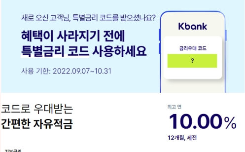 케이 뱅크는 9월 7일부터 10월 31일까지 신규 고객을 대상으로 특별금리 우대 코드를 제공하고 있다. 총 10만 개의 금리우대 코드가 소진될 때까지, 해당 적금 가입 고객들은 최소 5%에서 최대 10%의 금리 혜택을 볼 수 있다. 월 납입액 최대 30만 원, 최장기간 3년까지 적용되는 혜택이어서 당첨만 된다면 그야말로 '꿀' 적금이라고 할 수 있겠다.