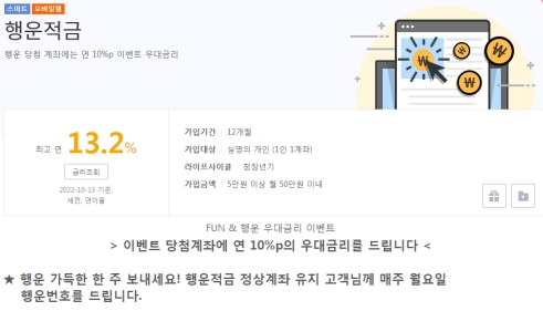 광주은행이 지난 9월부터 내년 3월 12일까지 판매하는 행운 적금은 최대 13.2%라는 역대급 연 이자율을 달성할 수 있는 적금이다. 가입 이후 매주 금요일마다 행운번호를 추첨해 가입자의 배정 번호가 이와 일치하면, 기본 3.2%에 우대금리 10%가 더해져 13.2%의 연 이자율이 실현되는 것이다. 최대 50만 원까지 12개월간 납입할 수 있고, 가입 기간 내내 매주 당첨 기회가 있으니 도전해볼 만하지 아니한가?