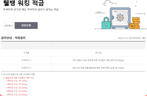 웰컴 저축은행에서 가입할 수 있는 웰뱅 워킹 적금은 '뚜벅뚜벅 걷기만 해도 차곡차곡 금리가 쌓이는' 적금이다. 월 최고 20만 원씩 12월 만기로 가입할 수 있는데, 기본 1%에 가입기간 동안 500만 걸음 이상 걸으면 8%의 우대금리를 받을 수 있다. 여기에 6회 이상 자동이체 시 1%를 더해줘 최종적으로 10%의 연이자 혜택을 얻을 수 있다.